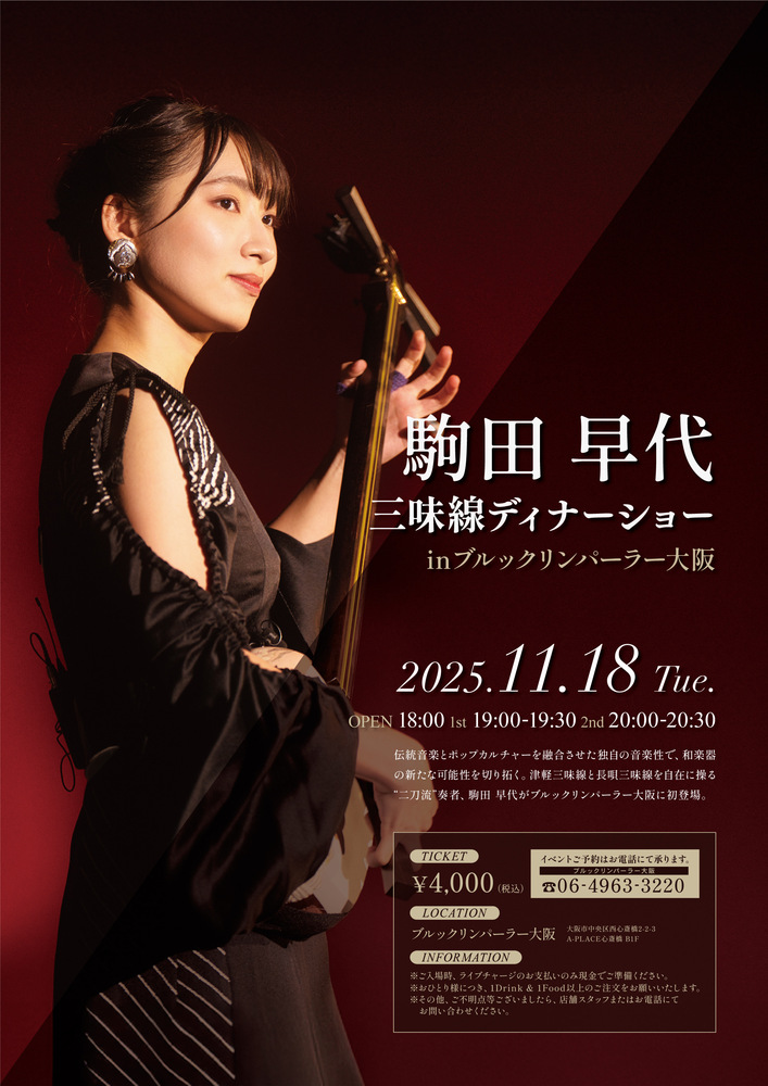 伝統音楽とポップカルチャーを融合させた独自の音楽性で、和楽器の新たな可能性を切り拓く。津軽三味線と長唄三味線を自在に操る“二刀流”奏者、駒田 早代がブルックリンパーラー大阪に初登場。